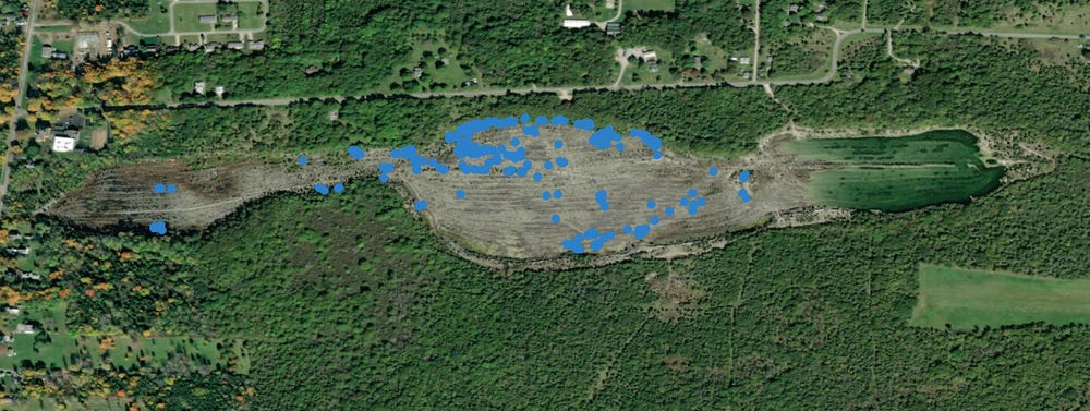 In order to test this, one of the things I need to do now is look at the different spatial join matches that exist between the glacial stones and the rows of limestone piles throughout the quarry. The locations of glacial stones is a kind of point data, and I’ve been able to import that into my GIS as a feature class, but the rows of limestone piles are line data, and I don’t have that data recorded. Initially I was planning to use the satellite imagery as an overlay and trace the rows, but I’m having trouble getting the granularity of data that I want from the base map imagery and so I’m now going to grab that data by walking the piles in the field and tracking waypoints with my GPS so that I can import the data and populate the map with a feature class that has been ground-truthed.