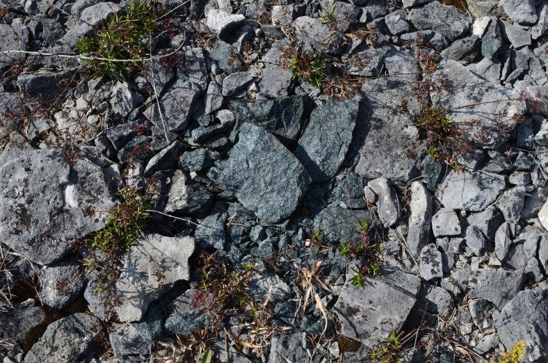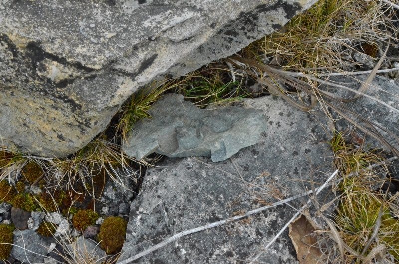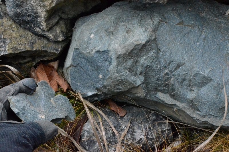 There was one stone that I found in the quarry during a scouting trip that I was unable to locate during my actual survey. It was a dark green granitic stone that had been fractured into a couple dozen shards. I have a photo of the stone from the scouting trip, but for whatever reason, I did not come across it again and it is a mystery to me. I'm going to look for it again in the spring.