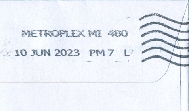All mail that I send and receive goes through Metroplex and along with 30,000 other mail pieces each hour, zips through one of their Advanced Facer-Canceller System (AFCS) machines and has a facer cancel applied to the mailpiece marking it with the Metroplex Michigan designation.