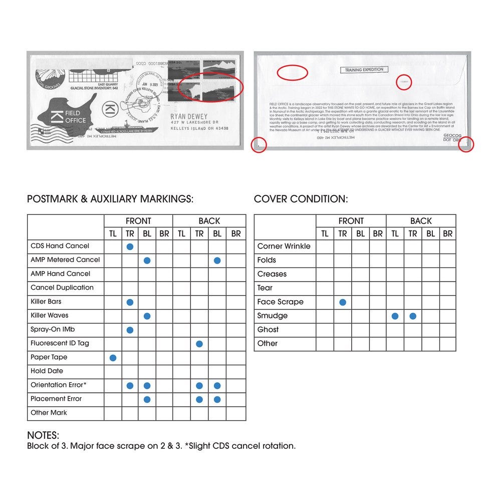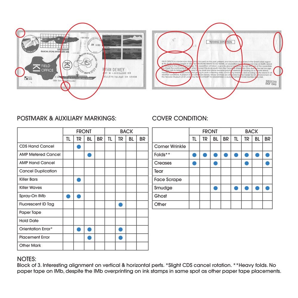 When I look at the collection as a whole, it is clear to me that the person who processed these covers at Metroplex in Michigan was having a very bad day. As I mentioned, I've built a taxonomy of how these covers were processed and there are at least 32 types of handling in this collection, along with excessive marking, folding, and damage to both the stamps and covers. After I finished cataloging the auxiliary markings and cover condition characteristics, I began thinking of this edition as a corpus of data on the mail system. As individual objects they’re a commemoration of my expedition training, but as a whole collection, they’re also an index of how Area Mail processing centers impact the lifecycle of bulk mailing of items of philatelic interest.
