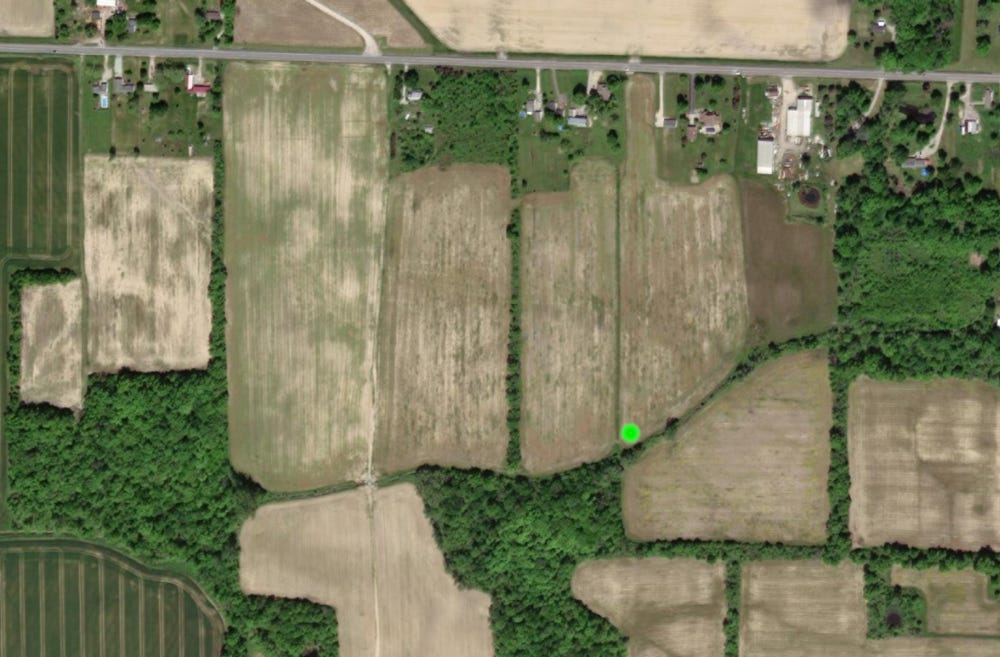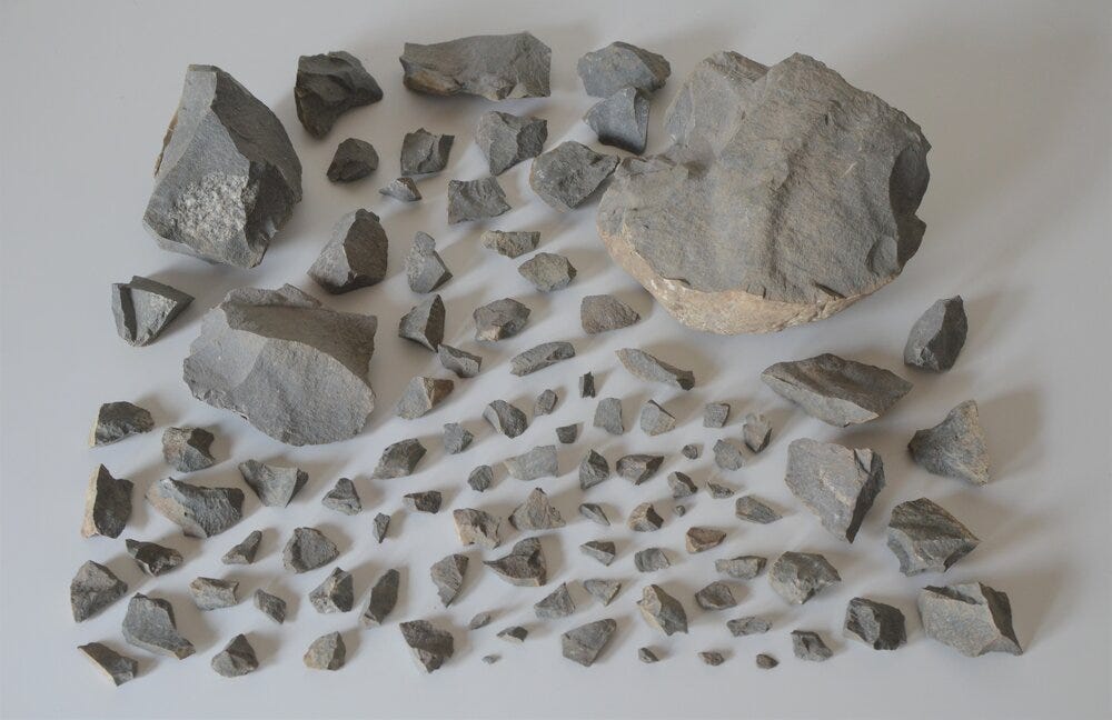 I asked about re-sedimentation because over the past decade I’ve collected a number of glacial erratics in a farm field in Huron County, Ohio in a location south of where I found this granite erratic, and some of them ended up in this field because of re-sedimentation. This part of Ohio is flat because the surface is a terminal ground moraine made up of a thick layer of glacial till, and since flat land is great for farming, this glacial till is constantly being plowed over. Not to mention uplift, the phenomena where heavier materials rise to the surface. If you buy blueberries in a plastic clamshell container, then you’ve seen this happen because the larger blueberries always make their way to the top of the container while the smaller ones fall to the bottom. It’s a packing problem, and it also happens where different soil layers touch, so glacial erratics sitting in till from earlier glaciation can make their way into the layer of till from a more recent glaciation, eventually finding the surface, and occasionally being struck by a plow, like this specimen which I found in the farm field after it had been shattered into at least these 97 pieces I picked up: