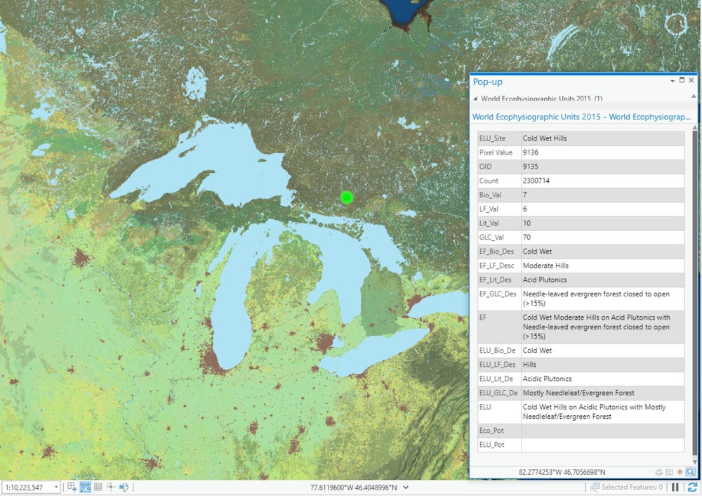I need to find another way to leverage data, but first I need to get some positive identification on the minerals in my stone. I think there might be other data besides isotope data that can help pinpoint this answer though. Let’s say my stone happens to have a significant percentage of a particular mineral, and I’m able to find plutons in the Canadian Shield that tend toward presenting a higher percentage of that particular mineral (say by correlating the ph of that higher percentage mineral with vegetation patterns as markers - which if you don’t know, soil ph is a major determining factor for what types of plants grow and where). Then this vegetation data should help define possible zones for investigation of those sections of the Canadian Shield. Currently, I’m using the ecological land units base map in arcGIS which was derived from data repositories of bioclimates, landforms, lithology and land cover, and I’m wondering if I can use that data (which already has gross parsing of vegetation), that it could help eliminate the places I shouldn’t look. Here’s a screenshot of my map: