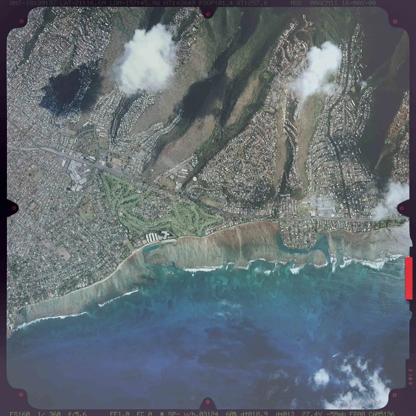 Geography is a part of the urban experience because geography supports urban development, giving the city a place to grow. At the same time, geography limits the reaches of the city as some land is more suitable for urban development than other land. Cities that adapt themselves to natural boundaries seem to feel like they belong in a place because they fit themselves to the lay of the land. This is a naturalness of fit that cannot be attained by way of bulldozer. Consider the Ko‘olau Range whose leeward slopes create a border for part of Honolulu, the mountains become a backdrop for the city as the city creeps upward on some of the slopes of the Range, interlacing themselves with the finger valleys that descend and tickle their way into the city. Notice this edge in aerial image #1. This image calls to mind Charles Mulford Robinson’s (1906) description of Honolulu as “one great park, with a city tucked in between, in the vacant spaces”. This border between urban form and landform is like a needle and thread stitching back and forth to hem the edge of the city, the geomorphology both enveloping and penetrating the neighborhoods to create a boundary.