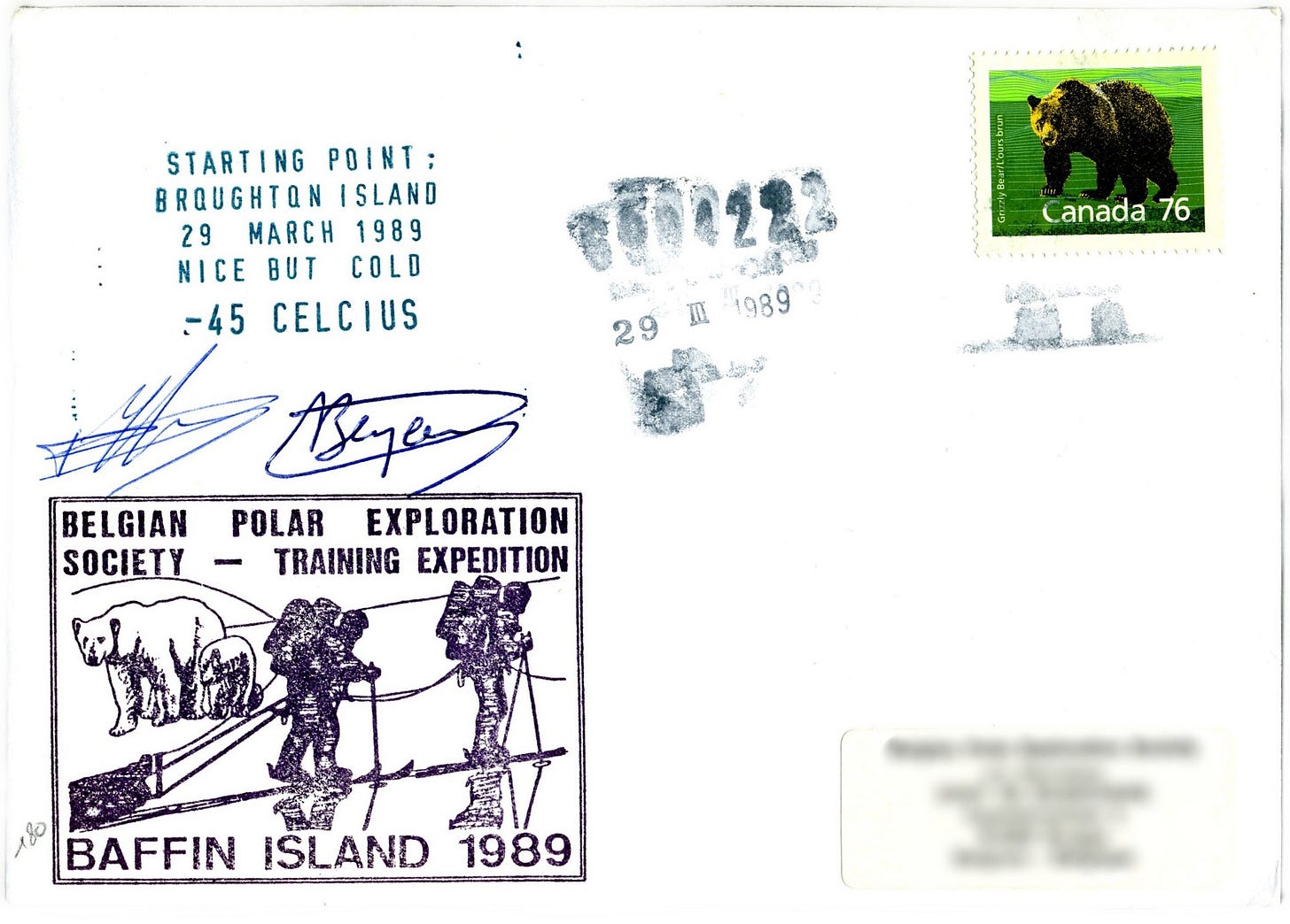 There is some precedent for considering training activities within the category structure of polar philately. In fact, one of the first polar covers I collected was produced by the Belgian Polar Exploration Society during a training expedition in 1989. Depicted on the cover a team of two explorers (presumably the cover signatories) trek across an ice field towing a pulk sled past two onlooking polar bears. Above this scene, a text stamp describes the departure site and provides the commentary “NICE BUT COLD -45 CELCIUS.”