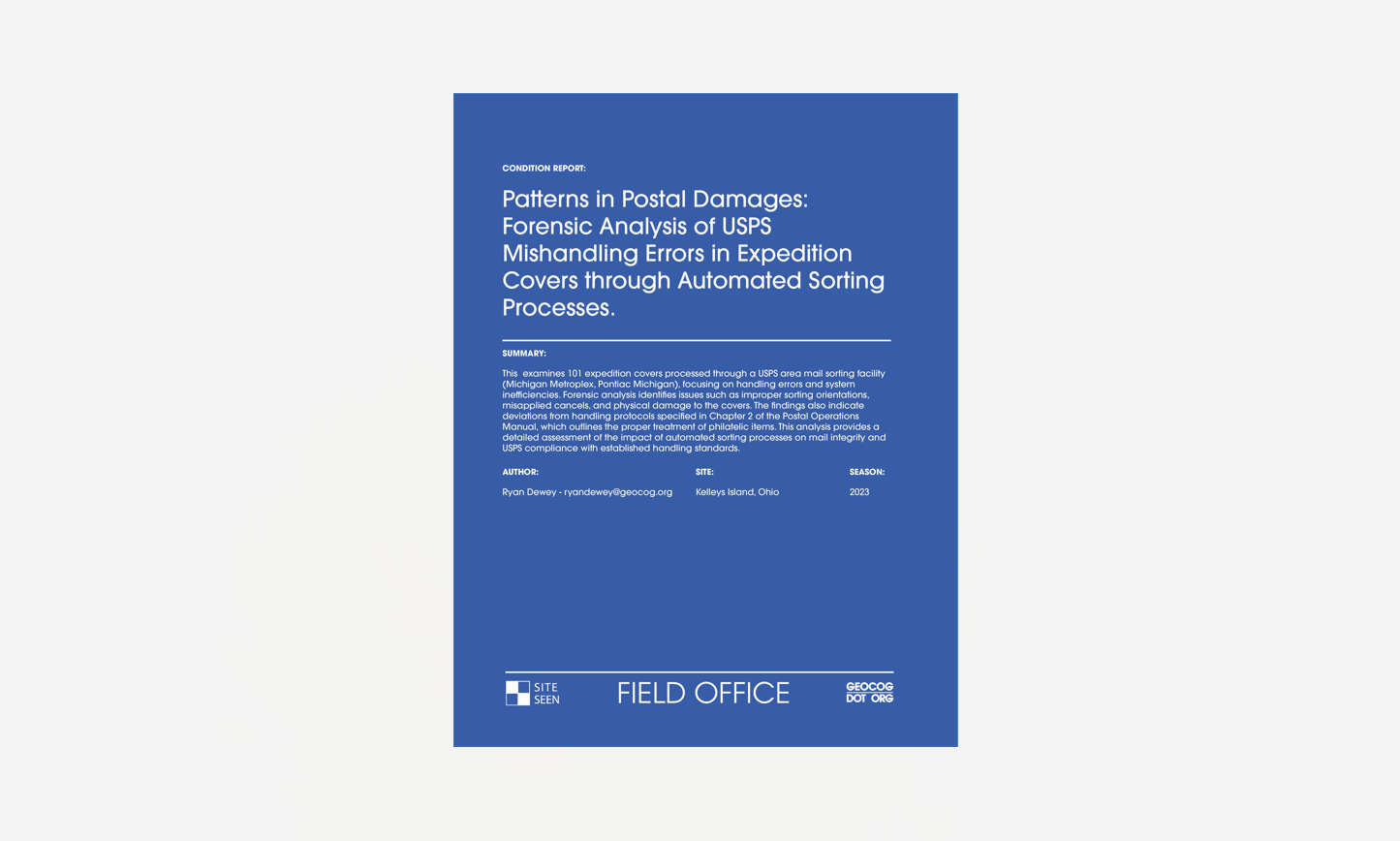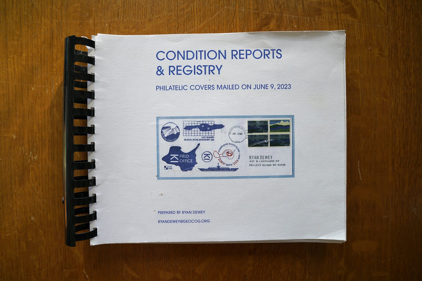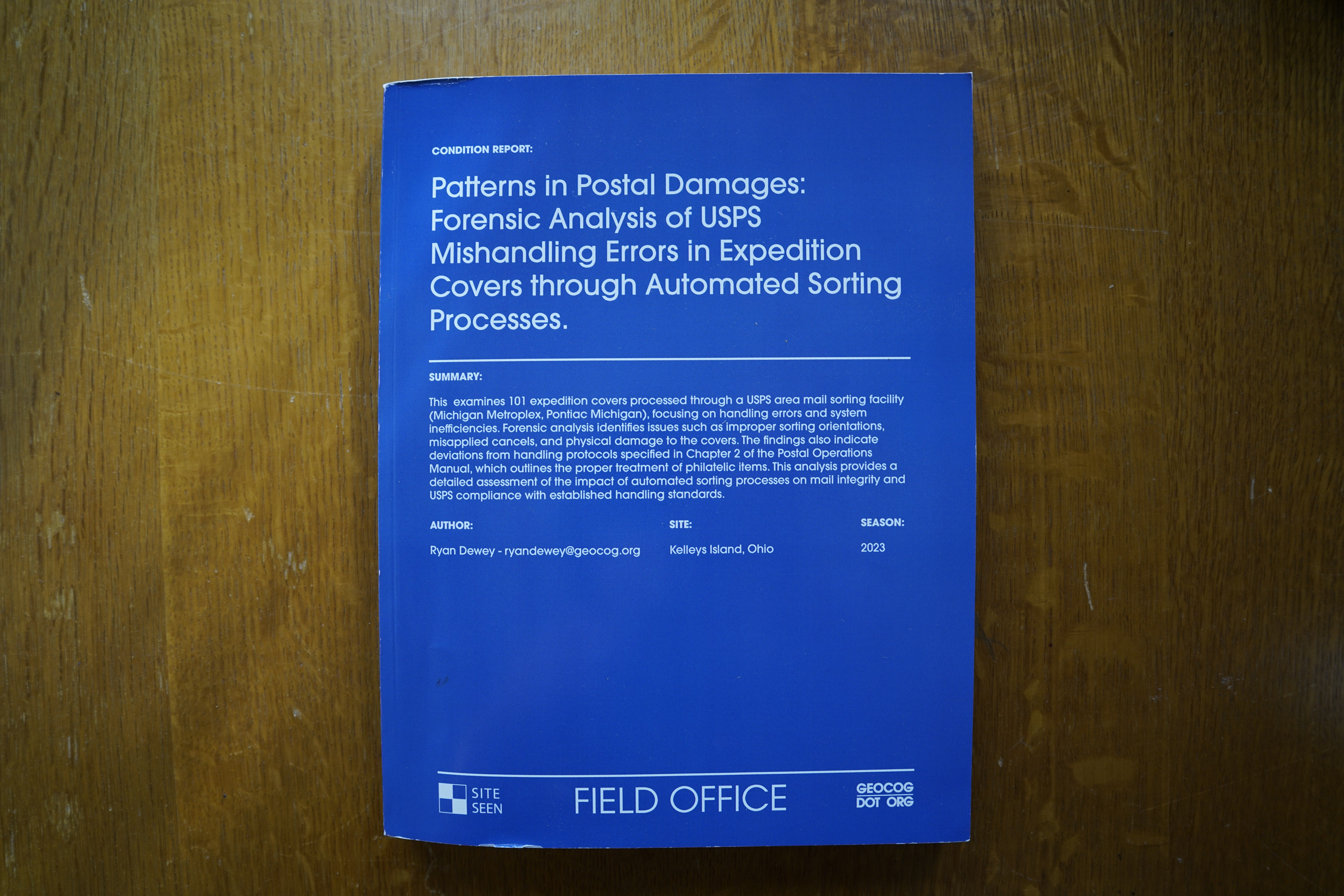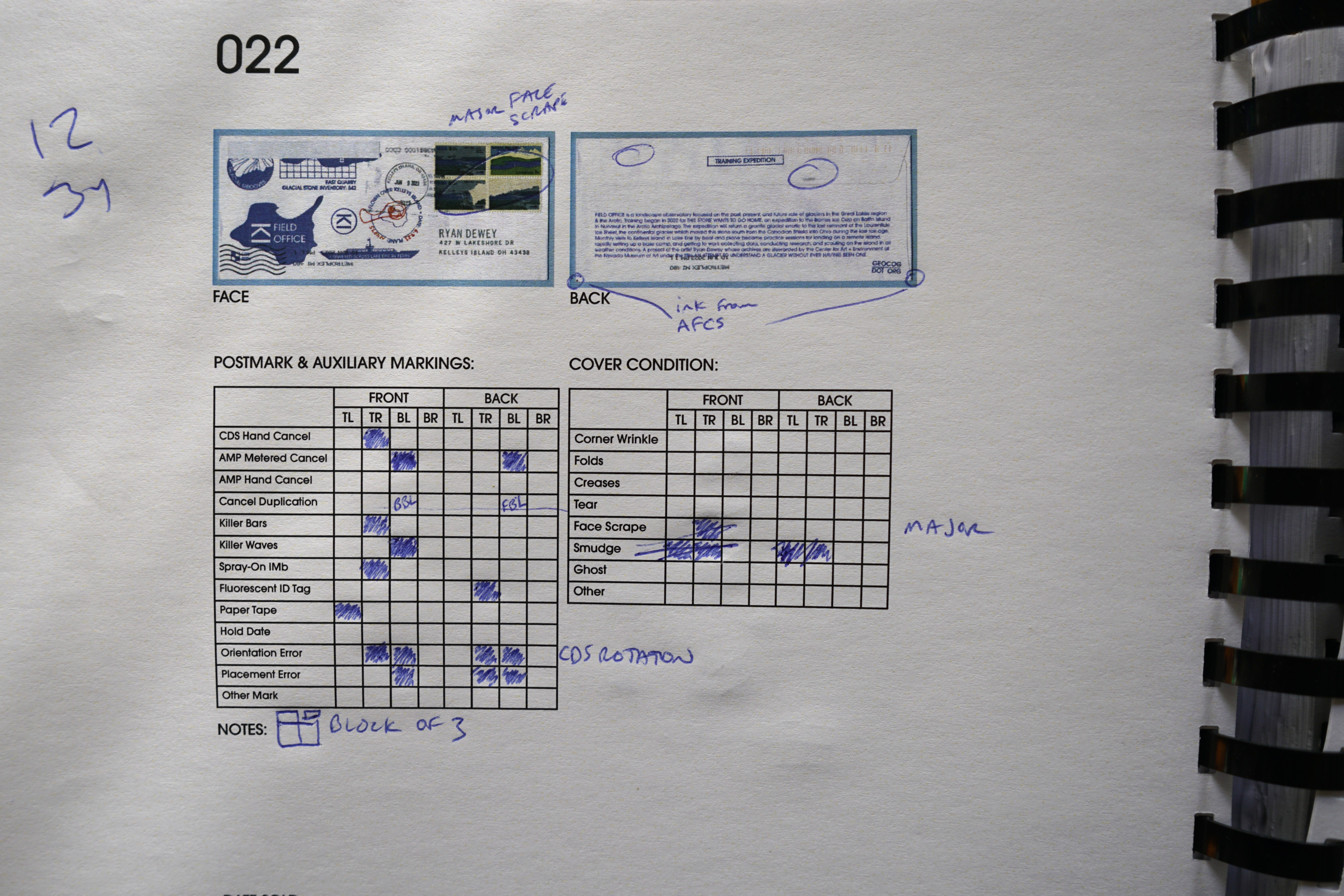 In June 2023, I produced an edition of 101 cacheted expedition covers as part of training activities for a forthcoming field project on Baffin Island. These covers were mailed to my temporary address on a Great Lakes island and processed through the USPS Area Mail Processing facility in Pontiac, Michigan. My intent was to sell them individually as records of my training activities, but I decided to keep them together because upon their delivery back to my address, the set of covers displayed extensive mishandling, including folding, scuffing, ink transfer, and misaligned cancellations, despite having been prepared in strict compliance with Chapter 2 of the Postal Operations Manual, which governs the proper handling of philatelic mail. I realized these covers comprised a corpus of mishandling as much as a record of my training activities.