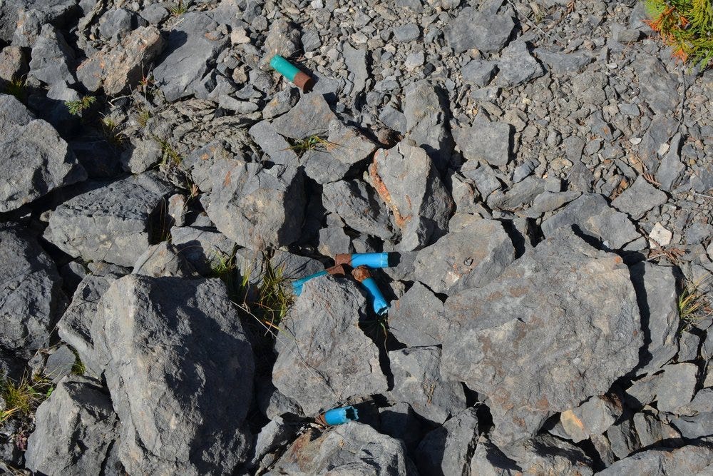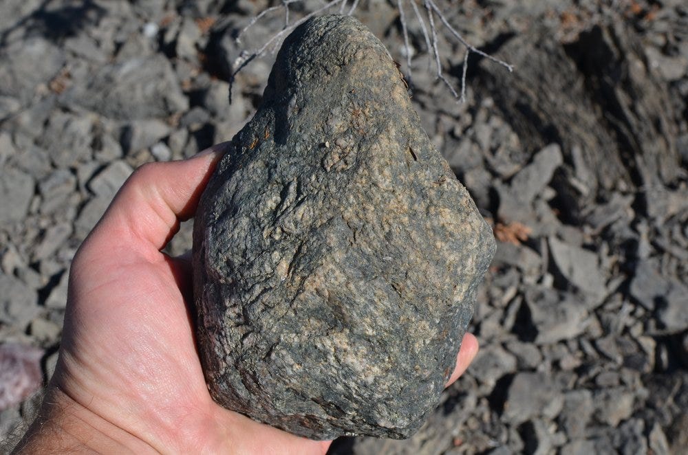 The granite on Kelleys was evenly distributed throughout the quarry, but workers at Rockport seemed to have concentrated the granite into denser piles. In fact, during the first 60 minutes of the walk, I only found about 100 stones in Rockport, but the last 30 minutes as I was walking toward the mouth of the quarry that opened to the road that led to the loading docks, I found 150-170 stones from large cobble to small boulder size. The density of the granite suggested that they were concentrating it and possibly sorting it as the railcars headed to the docks.