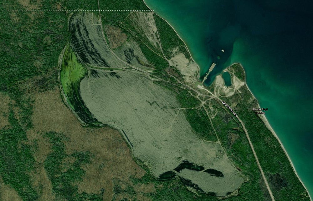 If you’ve followed my fieldwork on Kelleys Island, you know that I’m mapping the location of granite boulders left behind by workers in a limestone quarry. About a month ago I was looking at GIS maps of the Great Lakes and spotted a quarry on Lake Huron that looked similar to the Kelleys Island quarry, so last week I went to check it out. It’s in Rockport, Michigan, and the quarry is about five times the size of the quarry on Kelleys Island, but other than that, I didn’t know much about it until I arrived and walked around.