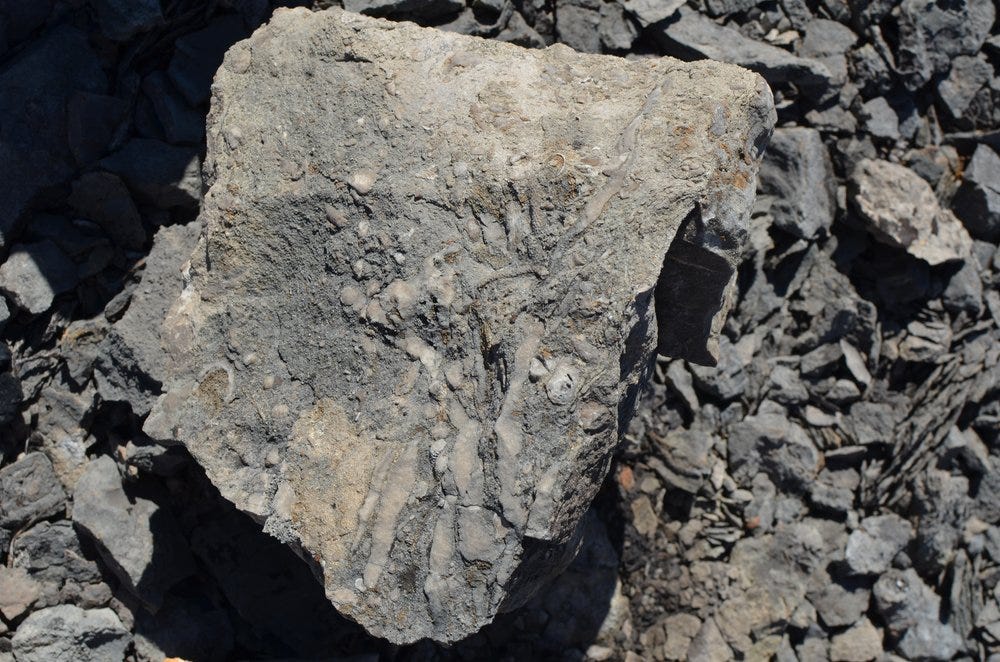 Like the quarry on Kelleys Island, Rockport was a limestone quarry. Kelleys Island is a Columbus Limestone member, whereas Rockport is Huron member, but they are definitely both Devonian-age, although between the two, Rockport seems to be the prime fossil bed. It was actually difficult to find pieces of limestone without fossils.