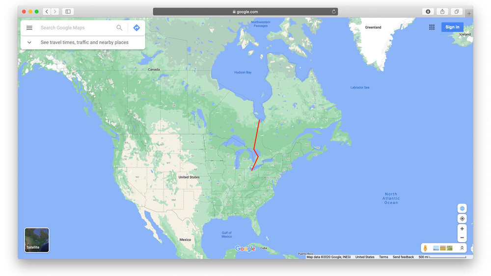 Here is a model of the planet before the last ice age, and before sea level rose to fill the Hudson Bay in northern Ontario. Before the Laurentian Ice Sheet melted into the Great Lakes which are absent from this image.