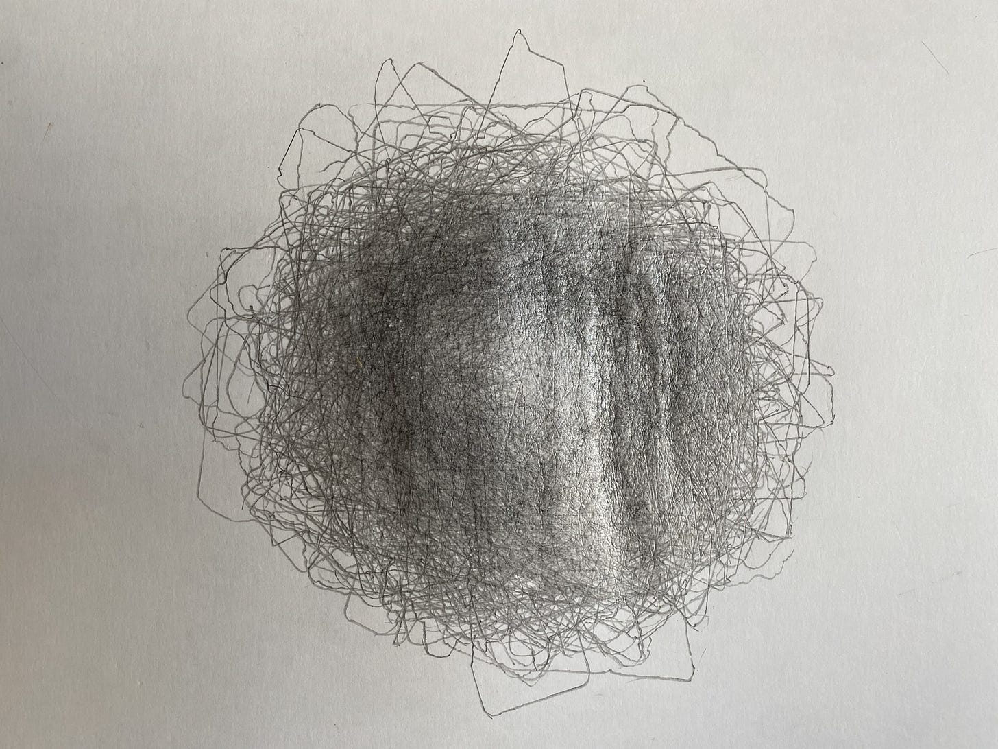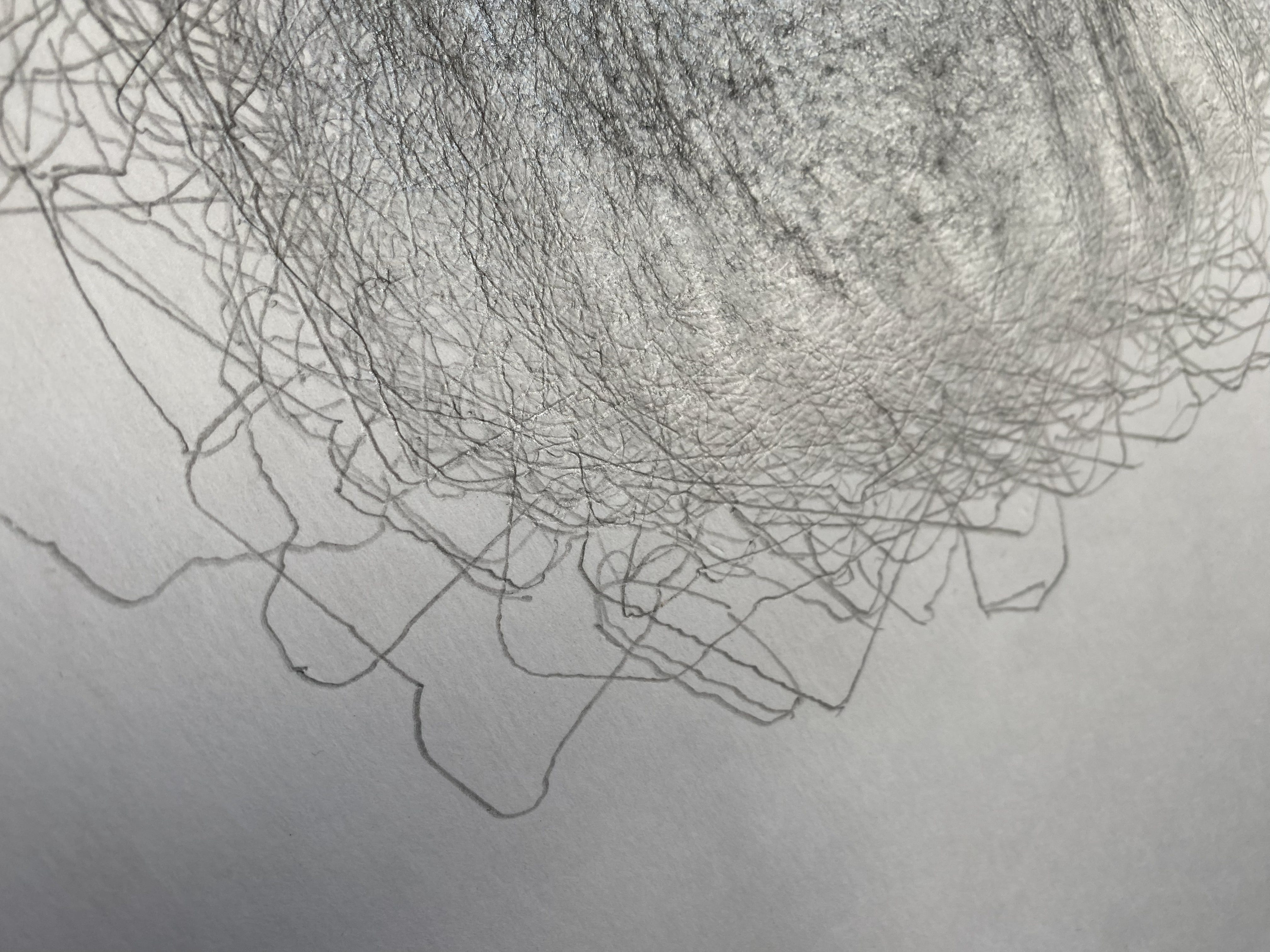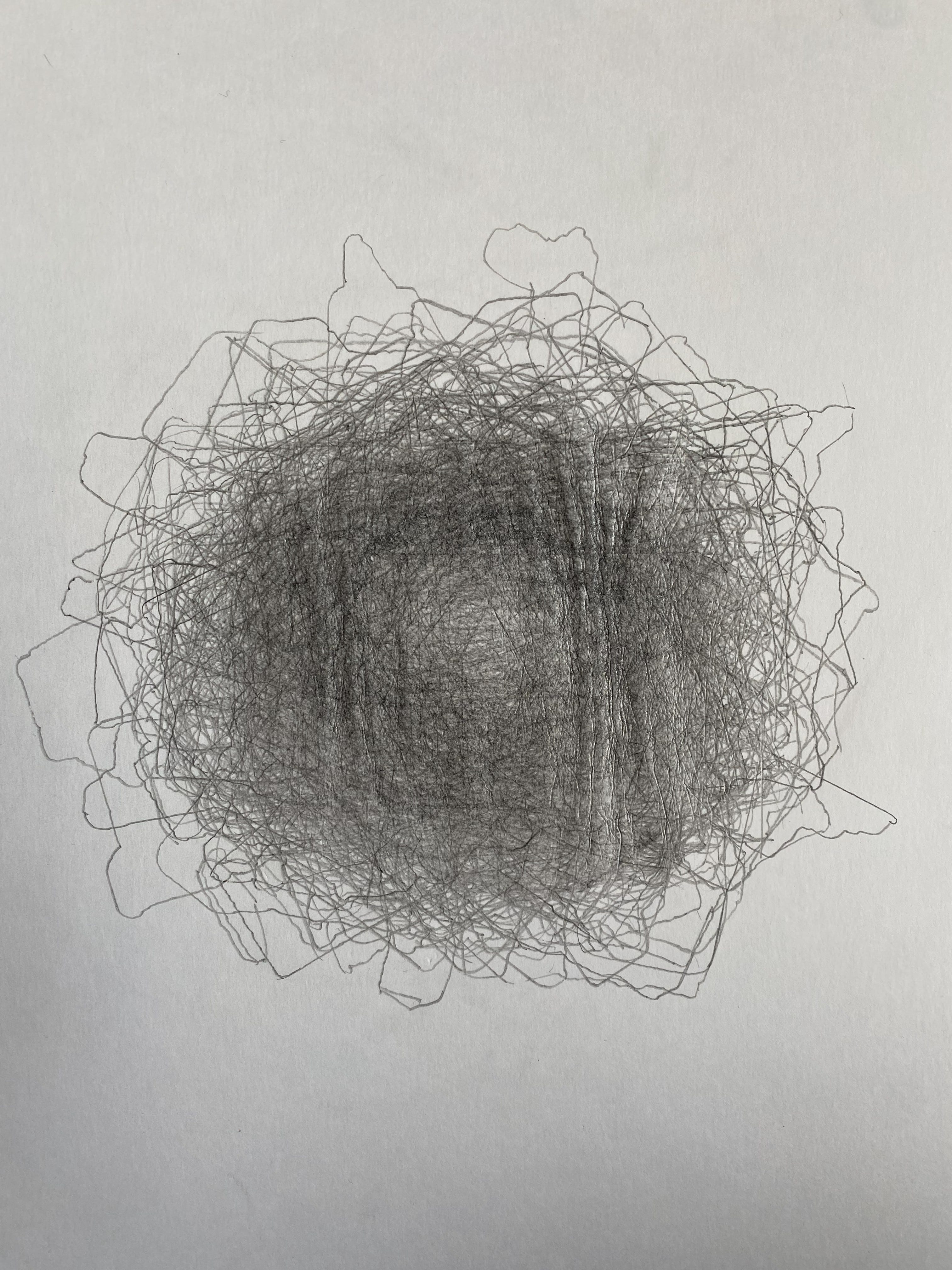 By the end, the paper held hundreds of contours. A dense, darkened taurus where the outlines overlapped most often. Fainter halos where they diverged. Peripheral lines that appeared once and never again. Toning, abrasive fuzzing of the paper from overworking, ridges following the line of the pencil around the object, polygon upon polygon created in the myriad intersections of lines crossing and crossing again. The surface of the drawings shimmer with the reflective sheen of graphite, making these drawings difficult to photograph. The paper cupped into a shallow bowl from the repetition of pencil moving the fibers of the paper, wrinkling the drawing in ways that make it impossible to flatten. All of these “defects” are actually indexes to the human hand.