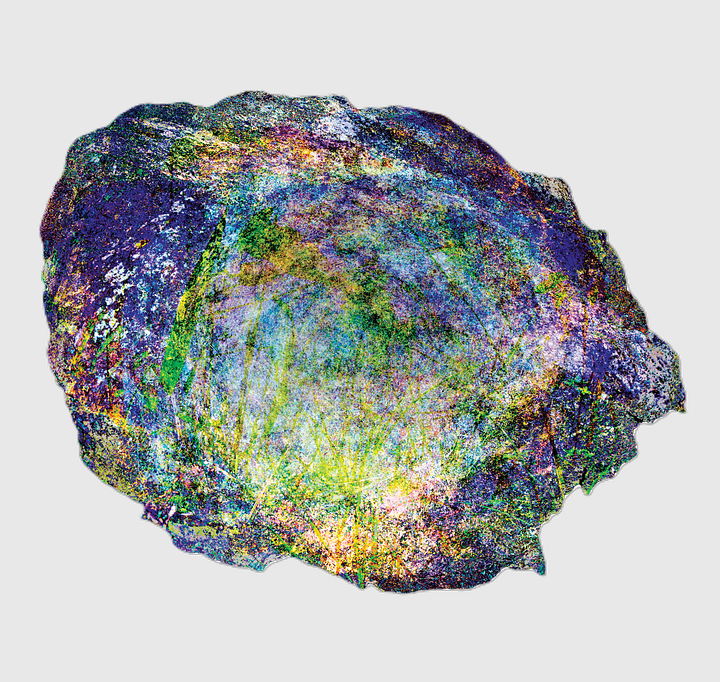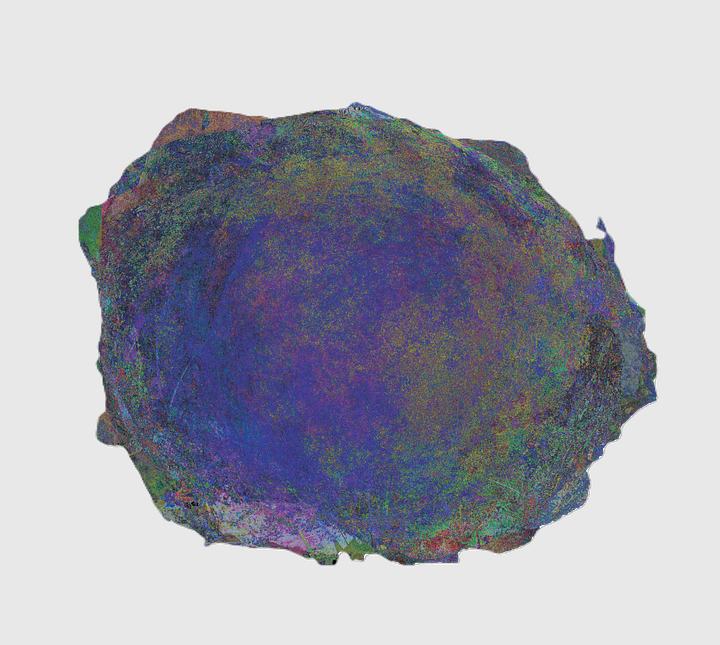 The machine has perfect recall and no experience. It can store every image and compute across all of them without fatigue, and do it across all pixels for the full depth of the stack. But it does not “remember” in the way a body does. It does not accrue familiarity. It does not learn a form through repetition. It only evaluates it, and re-presents it to us in visualizations, often in compressions we can’t experience in real life. For instance, this minimum stack analysis where the annular growth rings bleed through the stack to produce a crossing of growth rings impossible to visualize without computation: